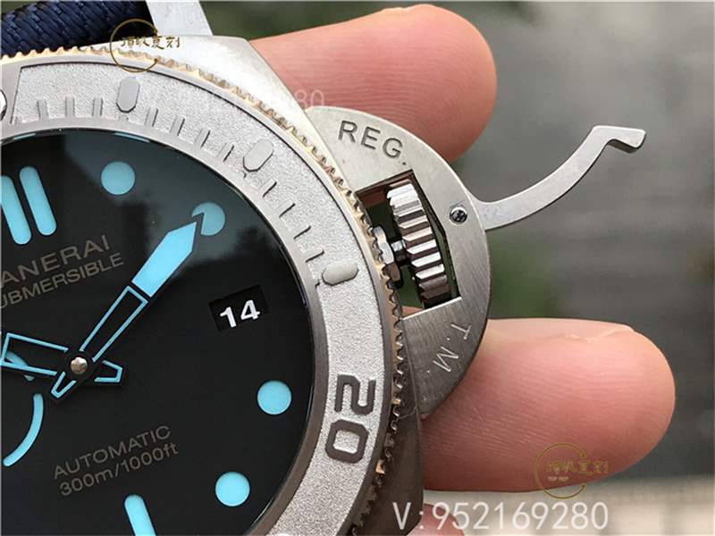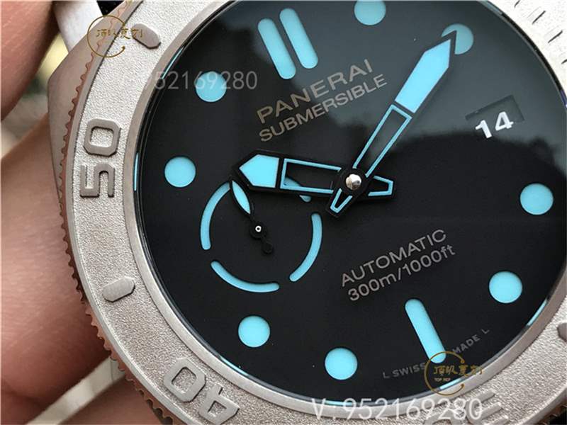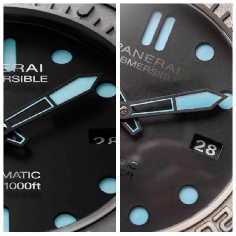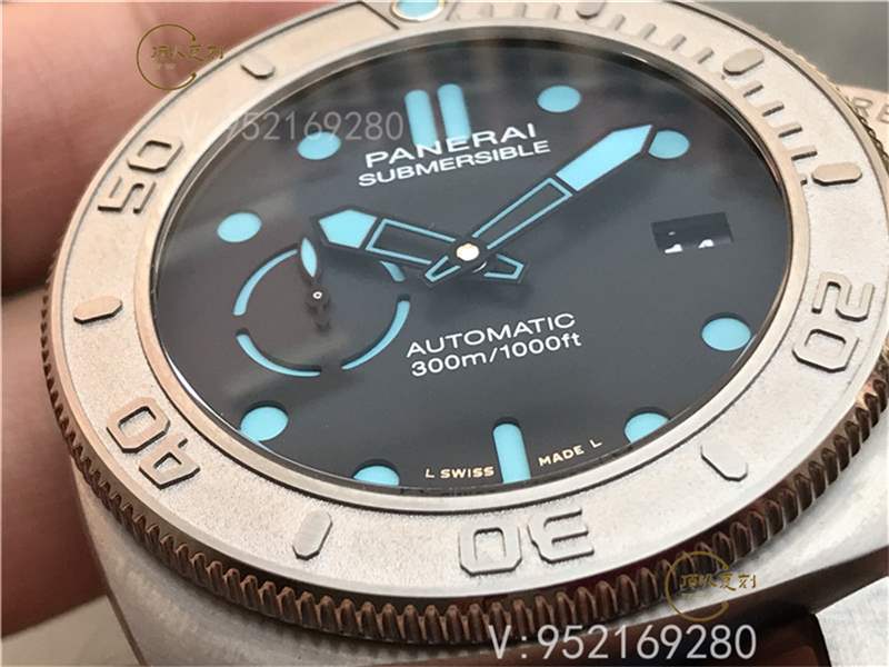 VS廠的沛納海985圈口同正品,都是立體數字結構。采用Eco-Titanium?材質,逆時針旋轉表圈附分度標,分度標志立體美觀,外表采用拉絲工藝,看起來非常平整,外圈凹槽內磨砂效果,為整只手表增添一種古樸的藝術感。借助其單向旋轉表圈,佩戴者可以放心地計算下潛時間,而涂覆在時標和大號鏤空指針上的Super-LumiNova?超級夜光涂層則確保腕表在漆黑的環境中依然可以清晰辨讀。
