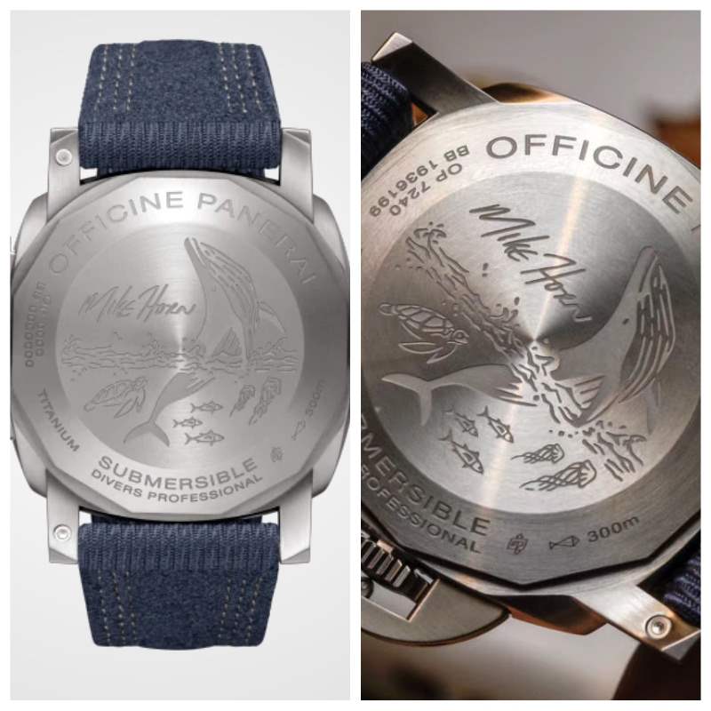 再就是背面,這是與正品最容易區分的一點。正品做工比較講究,那就是背面底蓋上鐫有邁克·霍恩(Mike Horn)的簽名及海洋生物圖案都是正方位,而復刻的比較隨意。別看這個很簡單,但是也需要非常困難才能達到。