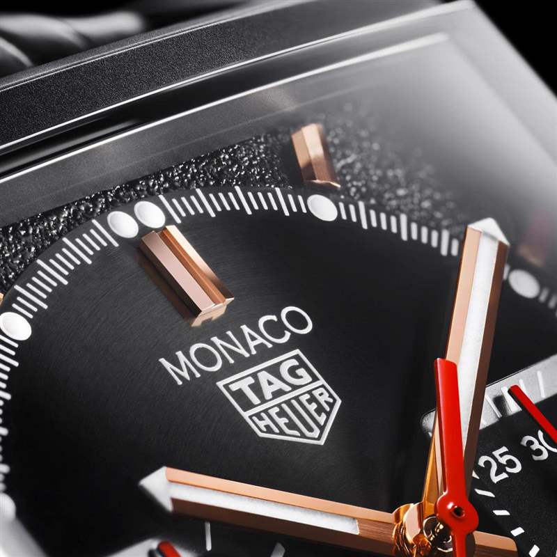 新的Monaco特別版腕表除了有全黑的外型,面盤四個角落的特殊粒紋,也是這次吸引人的細節設計。
