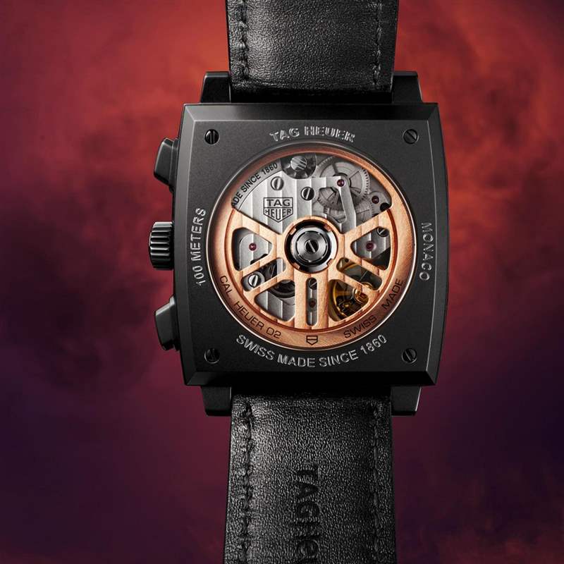 后底蓋可以欣賞Heuer 02機芯,其自動盤更特別施以玫瑰金涂層,與黑色表殼形成強烈對比。