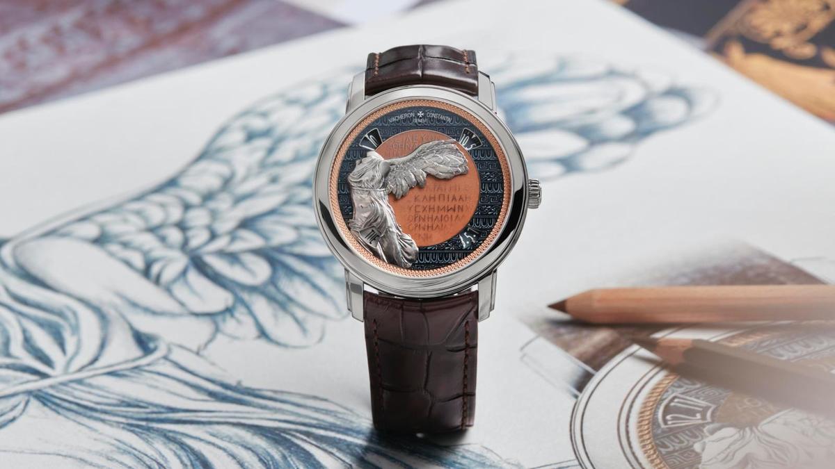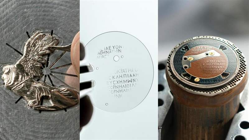 表款的主面盤是以棕色琺瑯呈現(xiàn),琺瑯工藝對(duì)于江詩(shī)丹頓來(lái)說(shuō)當(dāng)然不難,不過(guò)難的是這個(gè)棕色其實(shí)很難以調(diào)制,需要混合已經(jīng)停產(chǎn)的稀有琺瑯?lè)勰┎拍芡瓿伞6髅姹P旁邊的葉形和幾何圖案裝飾是采用灰階琺瑯,圖案的原型是古希臘的陶瓷花瓶,面盤外圈則以線雕工藝呈現(xiàn)金質(zhì)浮雕效果,接著同樣覆蓋上一片雕刻古希臘文字的藍(lán)寶石水晶膜片,再放上金屬噴鍍工藝的勝利女神,橘棕搭配藍(lán)黑般的面盤色調(diào)非常雅致,和勝利女神的優(yōu)雅形象很互襯。