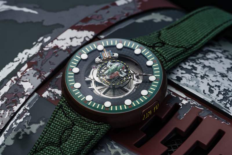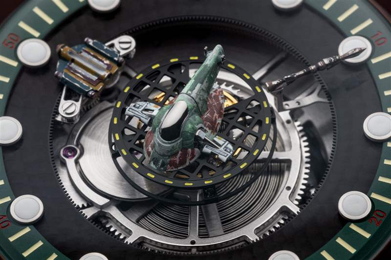 新款腕表采用相同的 45 毫米鈦金屬表殼和中央陀飛輪機芯,采用 Fett 的銹紅色和軍綠色制服,而不是死星的黑色。中央是 Slave II Firespray 炮艇,打開陀飛輪籠,而 Fett 的 Mandalorian 噴氣背包及其內(nèi)置導(dǎo)彈分別與小時和分鐘保持同步。
