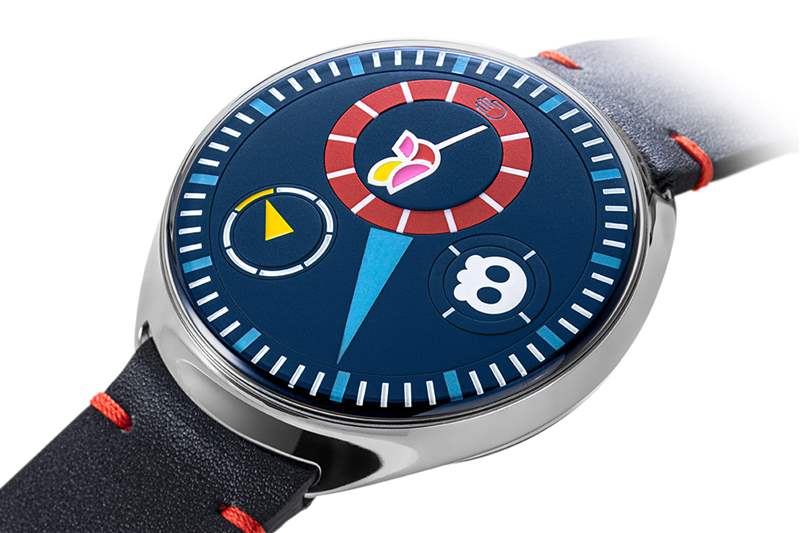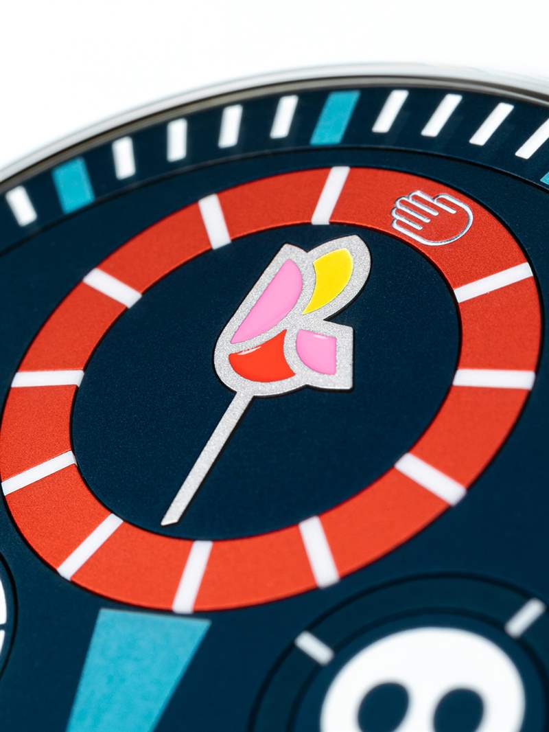“Vanitas”描繪了三個物體:一朵花、一個頭骨和一個沙漏。每個元素都被納入 Ressence 設計?;嫵闪诵r指示的指針,骷髏是卡通式的運行秒針,而沙漏則由黃色的三角形日期指針代表,對落下的沙子進行了程式化的處理。包豪斯對著名的自然主義靜物畫的重新詮釋非常出色。甚至使用的顏色都是完美的。