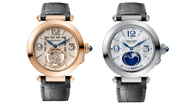 Pasha de Cartier玫瑰金浮動式陀飛輪腕表,表徑41mm,9552 MC型手上鏈機芯(左)、Pasha de Cartier月相款,表徑41mm,1904-LU MC型自動上鏈機芯(右)
