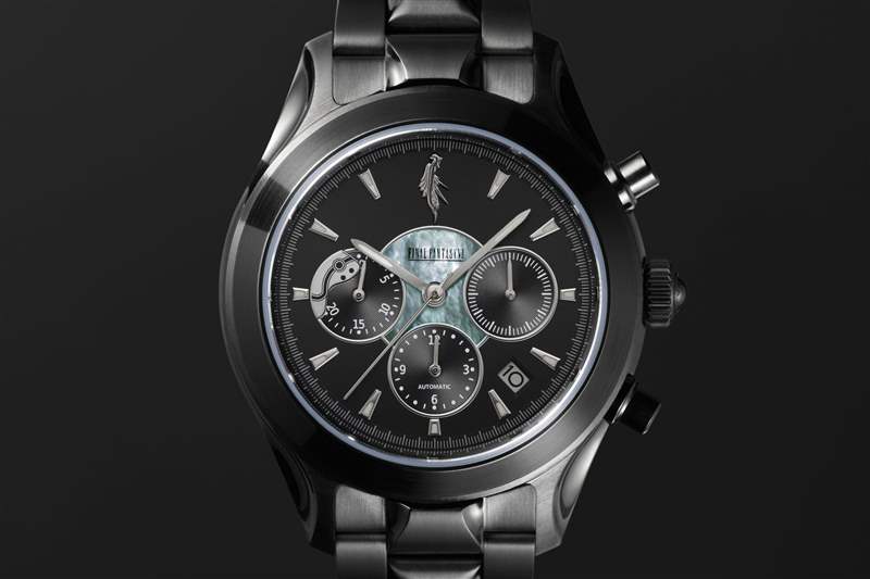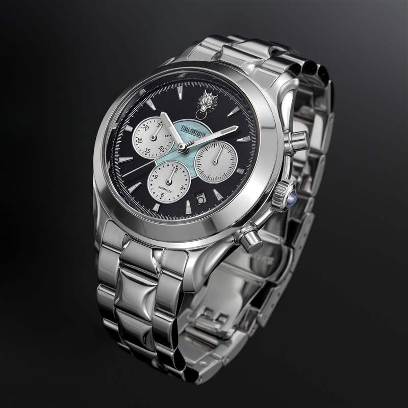 對于這件作品的主人公 Cloud,Seiko 選擇了光亮拋光的不銹鋼。人物的狼徽位于正面和中央,取代了 12 點鐘的刻度。在計時小表盤之間,珍珠母貝的內部表盤代表游戲中的行星生命力 Mako。最后的華麗是一頂藍寶石水晶王冠,靈感來自于游戲中的角色使用魔法的媒介 Materia。