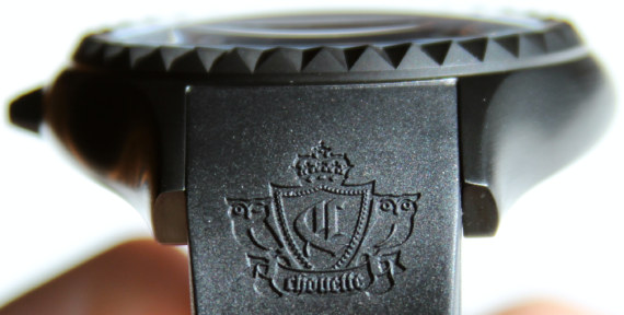 黑色涂層精鋼表殼實際上制作得很好。光滑的線條僅被冠部的黑色施華洛世奇凸圓形水晶打破。然后你當然有表圈 – 它襯有一圈金字塔形的釘子。非常適合搭配您一直想佩戴的帶釘狗項圈風格的項鏈。腕表背面鐫刻有Rock Candy和Chouette標志的表背。您還可以獲得限量版手表的編號。