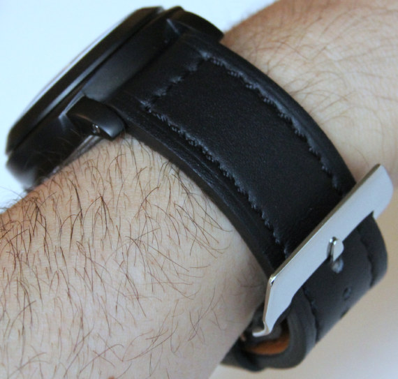 厚實(shí)的黑色24毫米寬皮革表帶為全黑,沒有任何tw0色調(diào)的縫線。我想知道這款手表搭配撞色縫合表帶會是什么樣子。我提到這一點(diǎn)的原因是,當(dāng)佩戴手表時,它整體非常黑暗。它幾乎感覺像是那些“幻影”手表之一,因?yàn)槭直砩系暮谏蠕撋嗟枚唷S行┤藭矚g這種外觀。我能說的是,與大多數(shù)幻影手表不同,表盤在這里并不難讀。