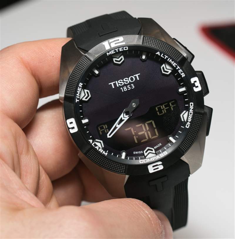 T-Touch Expert Solar 的尺寸比其他型號大,寬 45 毫米,但外殼感覺更薄。表殼本身出奇地輕巧,采用鈦金屬制成,防水深度達 100 米。雖然即使是鈦手表也感覺很輕。鈦將是大多數(如果不是全部)T-Touch Expert Solar 型號的材料。天梭進一步承諾提供一系列表盤和鈦手鏈。我們同意,就目前而言,表盤尚未完成,但它是實際概念的真實證明。