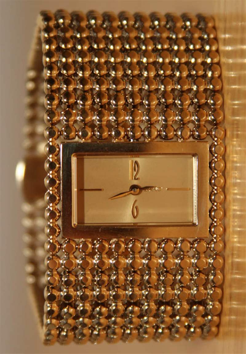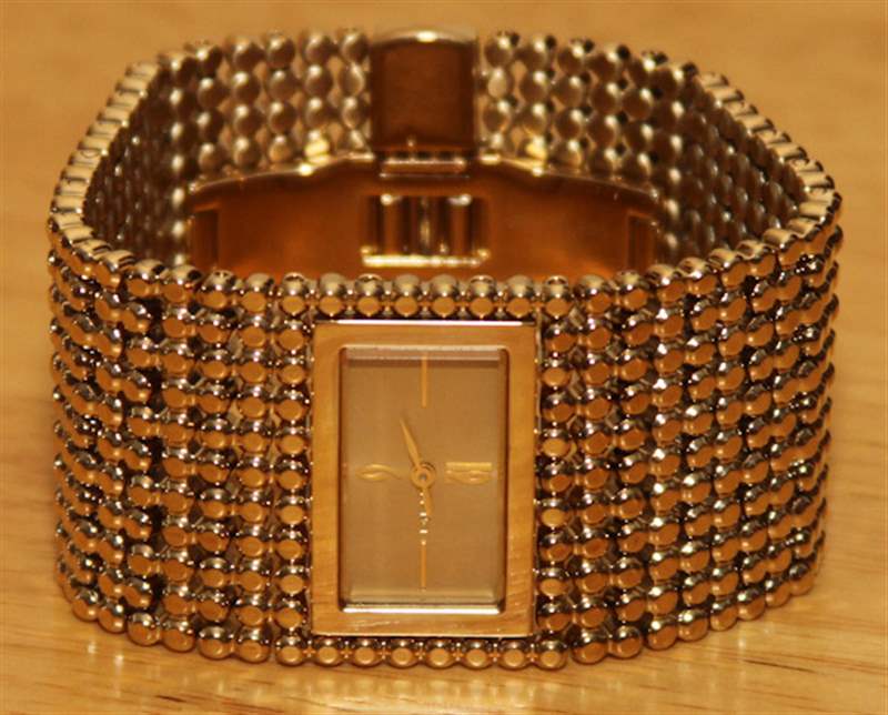 除了白色陶瓷款外,我還想介紹這款采用全玫瑰金色手鏈的手鏈式手表。這種款式可以追溯到 50 年前,看起來更像是手鐲而不是手表。設計中融入了方形表盤。我認為它相當時尚和酷。黃金實際上是在鋼上鍍金,細的手鏈鏈節柔軟且觸感光滑。
