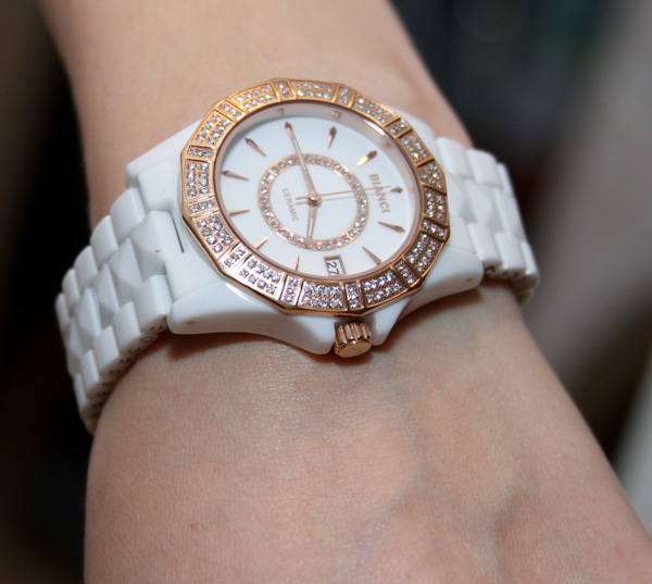 腕表寬 39 毫米,搭載日本石英機芯。它看起來很可愛(引用這位女士的話)并且可以搭配很多衣服。搭配舒適的陶瓷手鏈,非常實用。