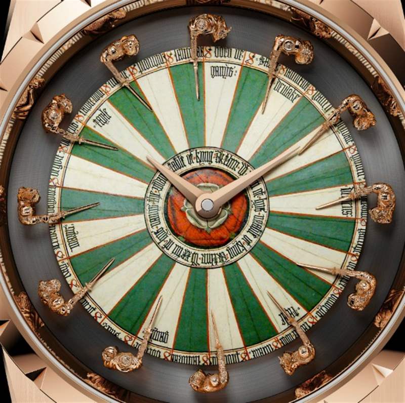 基礎腕表是 18k 玫瑰金 Roger Dubuis Excalibur 的 45 毫米寬版 (EX45)。內部是內部制造的口徑 RD822 自動機芯。可能有一個展覽底蓋。手表的表盤奇特,但確實具有歷史象征意義?!白雷印笔菕煸谟鴾貜厮固氐囊粡垖嶋H桌子的手繪琺瑯復制品。這張桌子是 16 世紀國王亨利八世委托制作的。當然,亞瑟王和圓桌騎士的傳說比這更古老——至少可以追溯到幾百年前。事實上,這幅畫所依據的桌子據說是 13 世紀中葉的。