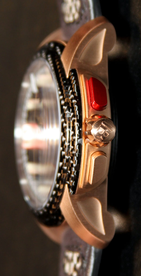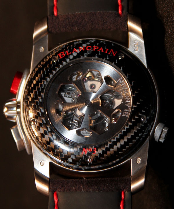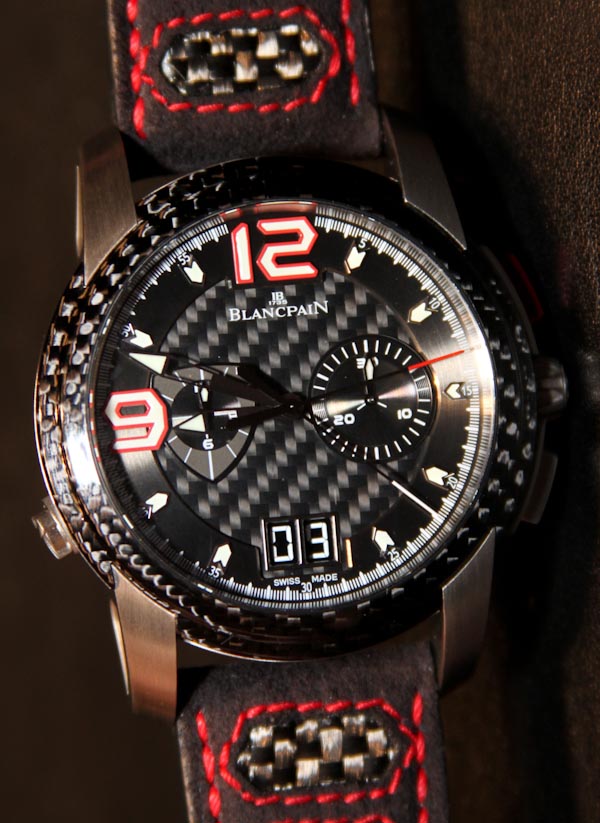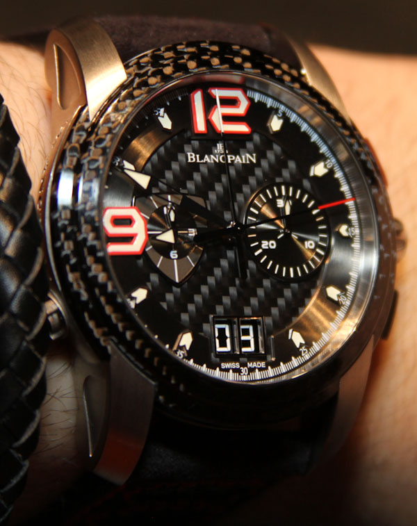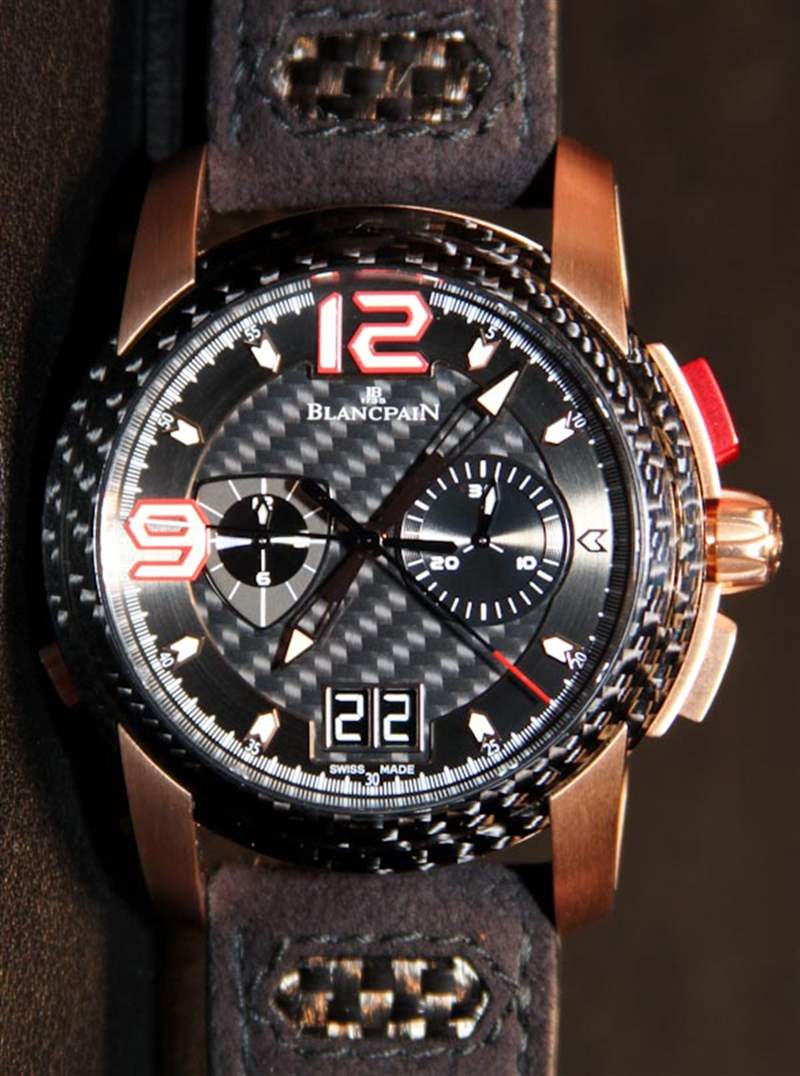 L-Evolution 雙秒追針飛返計時碼表表殼做工精美,有輕度(緞面)拉絲 18k 紅金或白金可供選擇。我認為選擇鈦金屬表殼會很有意義。表殼寬 43 毫米(防水深度達 100 米),包括與碳纖維表盤和表帶中的碳纖維元素相匹配的碳纖維表圈。這是很長一段時間以來(也許是有史以來)我第一次看到像碳纖維這樣的東西與黃金相匹配。與其他一些寶珀 L-Evolution 運動手表的一些極度不平衡的表盤不同,這款手表相對平衡且具有吸引力。如此之多以至于奇怪的大“9”和“12”點鐘小時指示器并沒有那么令人反感。