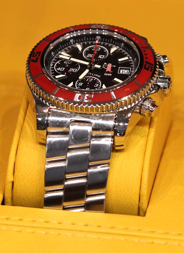 2012 年航空活動(dòng)的限量版腕表作為潛水表有點(diǎn)諷刺。這是百年靈 Superocean Chronograph II 44mm Limited Edition Reno National Championship Air Race & Show 2012 時(shí)計(jì)。此型號(hào)的特別之處在于鑲有紅色硫化橡膠表圈,并在表盤上貼上 Reno air races 標(biāo)志。手表的海洋主題似乎并沒有讓任何買家望而卻步。未售出的作品將分發(fā)給少數(shù)幾個(gè)百年靈經(jīng)銷商。
