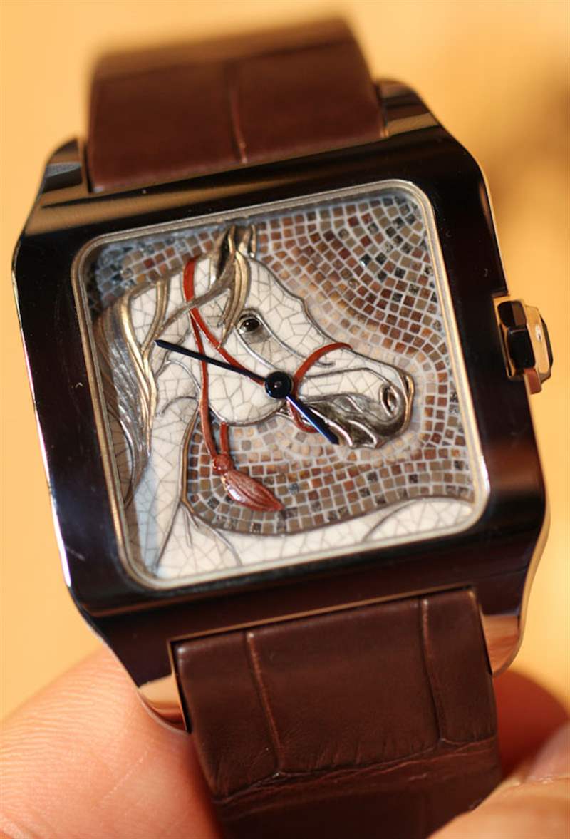 在 2012 年的藝術收藏中,我個人最喜歡的是本文頂部的手表。它使用 Santos-Dumont XL 表殼并展示一匹馬。該過程實際上是微鑲嵌。從柜臺到咖啡桌、石材或瓷磚,馬賽克是一種流行且著名的工藝。在這里,馬賽克藝術與黃金雕刻融為一體。馬的部分雕刻金質,而表盤的大部分是手工鑲嵌的寶石。根據卡地亞的說法,這個限量版系列的每一件作品都需要超過 120 小時的工作才能完成。每塊石頭都必須單獨挑選、切割和放置以形成圖像。這款手表稱為 Cartier Santos-Dumont XL 手表,馬圖案,寶石馬賽克,一套 40 塊 18k 白金,另外 10 塊表殼上鑲有鉆石。廣告留言廣告信息結束
