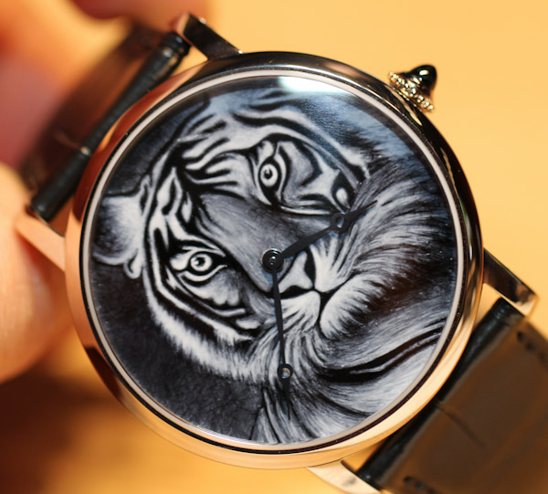 另一個有趣的藝術手表是最后一個展示的是 Rotonde de Cartier 42 毫米手表,白金,老虎圖案,琺瑯灰色。順便說一下,每款 2012 年卡地亞藝術系列腕表均搭載卡地亞自制 430 MC 或 9601 MC 手動上鏈機械機芯。Enamel grisaille 基本上是黑色和灰色琺瑯作品的一種形式——這里用來制作老虎的臉。結果是一只清晰的黑白色調的動物,除了從掠食性貓的鼻子伸出的手表指針外,還有一張幾乎栩栩如生的臉。我試圖說服自己它們看起來像是額外的胡須,但唉,它們只能告訴時間。非常適合回到野生動物園小屋的大型游戲獵人,這款手表將被限制為 100 塊,據報道每塊手表需要大約 40 小時的琺瑯工作。