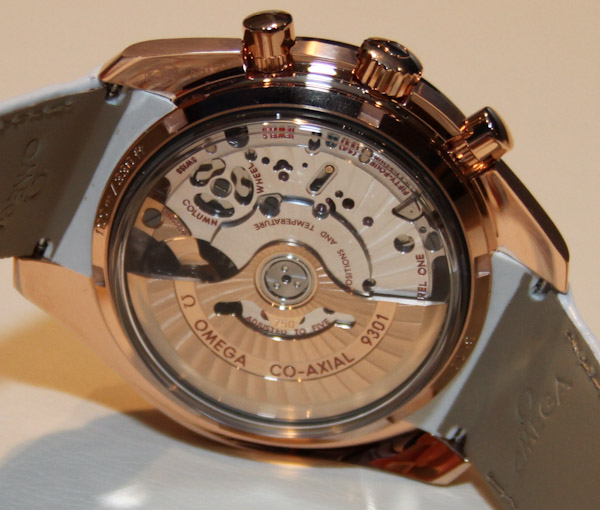 就像我說的,這里的主要吸引力在于除了手表是白色的外,它們還清晰易讀。表盤上混合的飾面和拋光確保了這一點(diǎn)。如您所知,這些較大的超霸表款的寬度剛剛超過 44 毫米,搭載了迄今為止最熱門的歐米茄機(jī)芯。我在其他地方討論過 9300,但它是一款內(nèi)部制造的歐米茄自動 12 小時(shí)計(jì)時(shí)碼表機(jī)芯,具有硅游絲和同軸擒縱機(jī)構(gòu)。9301 版本是完全相同的東西,但在擺輪上有一個(gè)金橋和一個(gè)金轉(zhuǎn)子。9301 機(jī)芯用于更高端的 18k 金超霸(或其他型號)手表。