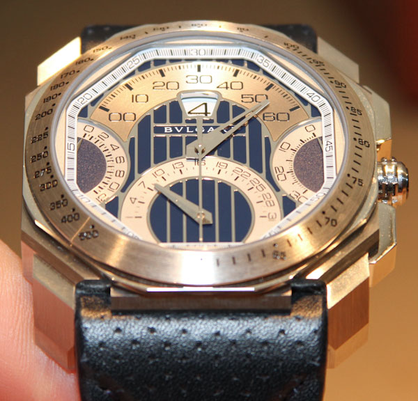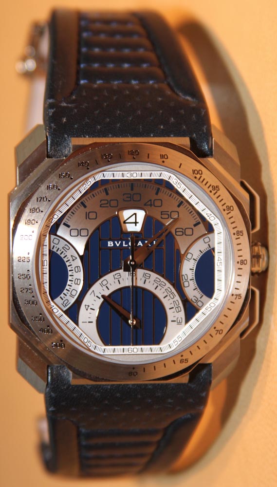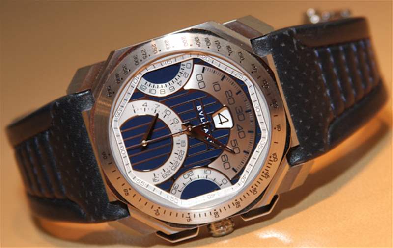 那個動作真的很漂亮。它包括著名的 Gerald Genta 逆跳分鐘和跳時報時系統(tǒng)(我在這里評測的 Gefica Hunter GMT 手表也使用了該系統(tǒng))。下方表盤是逆跳日期指示器。然后你有一個很酷的逆行 12 小時計時碼表,使用手表兩側(cè)的兩個扇形表盤。多么奇妙的表盤啊。四逆跳指針,跳時,華麗的對稱。這會讓已故的 Genta 先生感到自豪。請注意計時指針在靜止位置是如何指向下方和上方的。寶格麗設(shè)計的表盤采用銀色和藍色調(diào),與瑪莎拉蒂主題相得益彰。同時非常優(yōu)雅和古怪。廣告留言廣告信息結(jié)束