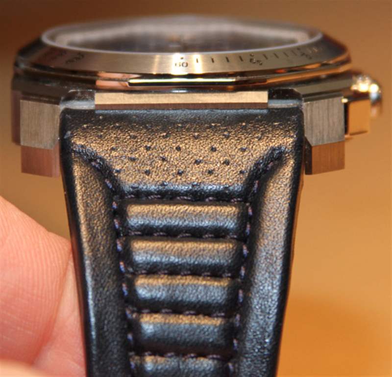 多年后,Octo 表殼仍然是酷炫前衛(wèi)與建筑靈感的健康結(jié)合。這款精鋼表殼寬 45 毫米,戴在手腕上比看起來更舒適。表帶與表殼緊密結(jié)合,仿照多款瑪莎拉蒂汽車的真皮座椅。這包括用于通風的填充部分和穿孔。