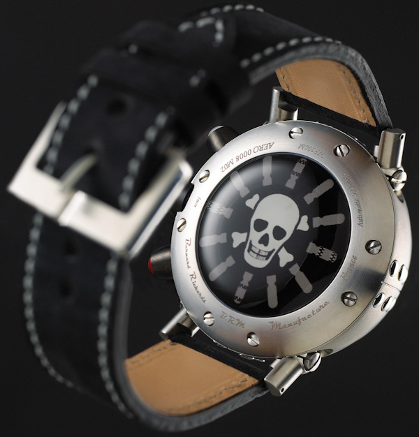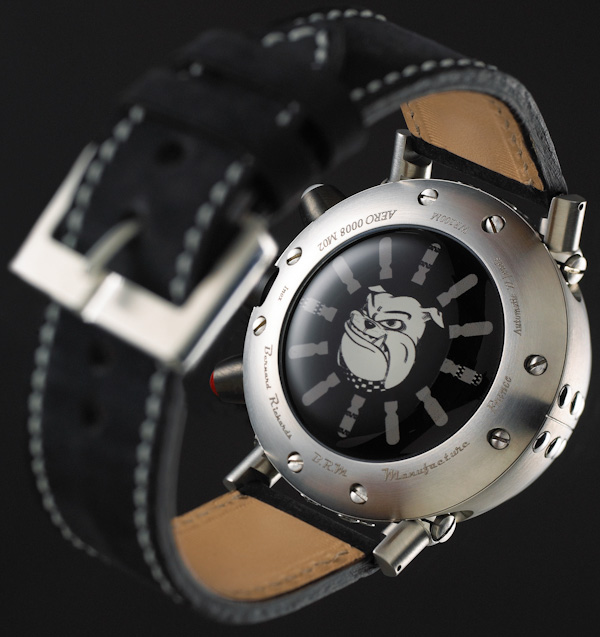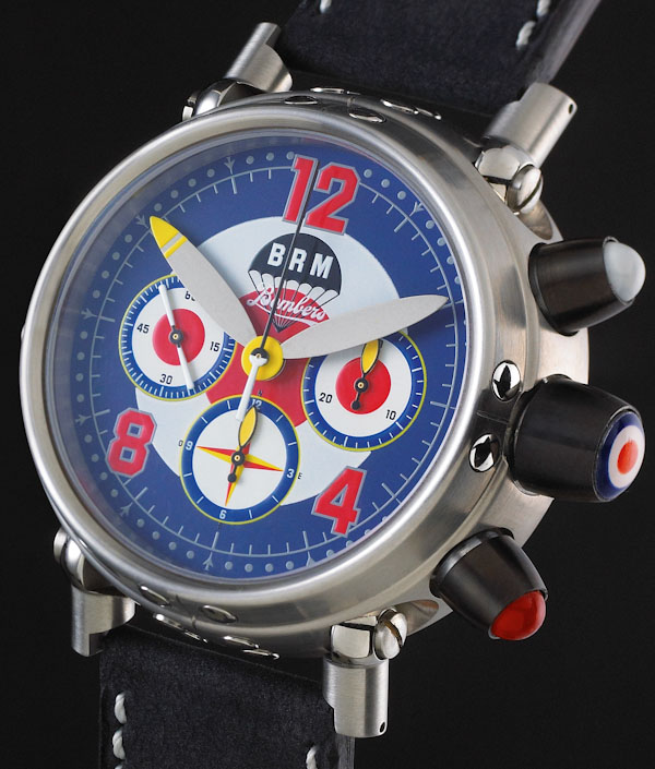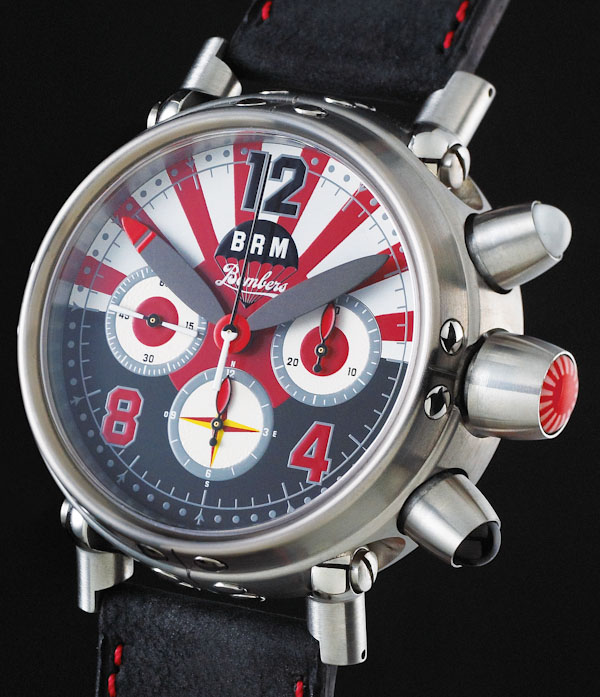 超大表冠和計時按鈕是魅力的一部分。它們應該看起來像機頭或燈。皇冠上有裝飾性的凸圓形寶石,也有幾種款式。手表的背面是另一個具有各種藝術風格的區域。BRM 轟炸機手表內部裝有瑞士 ETA Valjoux 7753 自動計時碼表機芯。