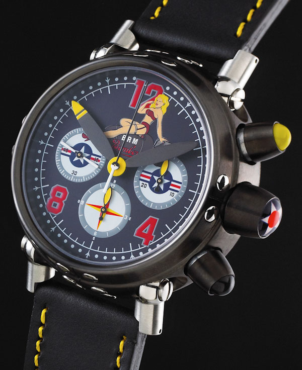 這一次,我看到螺旋槳式的手做得很好。大指針用于時針和分針,而更傳統的飛行員式指針用于計時小表盤。這里的易讀性非常高——我非常感謝。據 BRM 稱,表殼和表盤的風格很大程度上取自噴火戰斗機、P-51 野馬戰斗機和三菱零式戰斗機。想一想,那些轟炸機和戰斗機有區別嗎?最后這并不重要——你明白了。