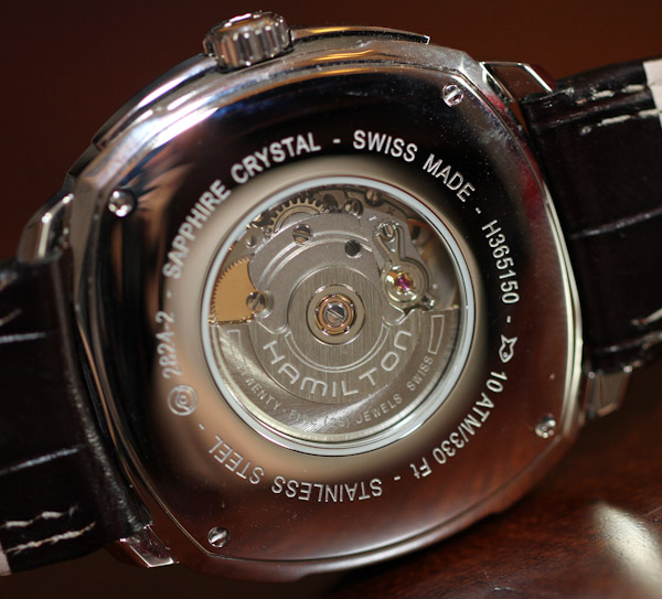 手表內(nèi)部是瑞士 ETA 2824 自動(dòng)機(jī)芯,可通過(guò)底蓋展示窗口看到。您可以看到表殼與機(jī)芯相比大了多少。關(guān)于這一點(diǎn)的一個(gè)提示是日期窗口在表盤(pán)上的位置。漢密爾頓設(shè)計(jì)了一個(gè)有意設(shè)計(jì)的圓環(huán),使日期窗口看起來(lái)不會(huì)奇怪地放在臉的中間。