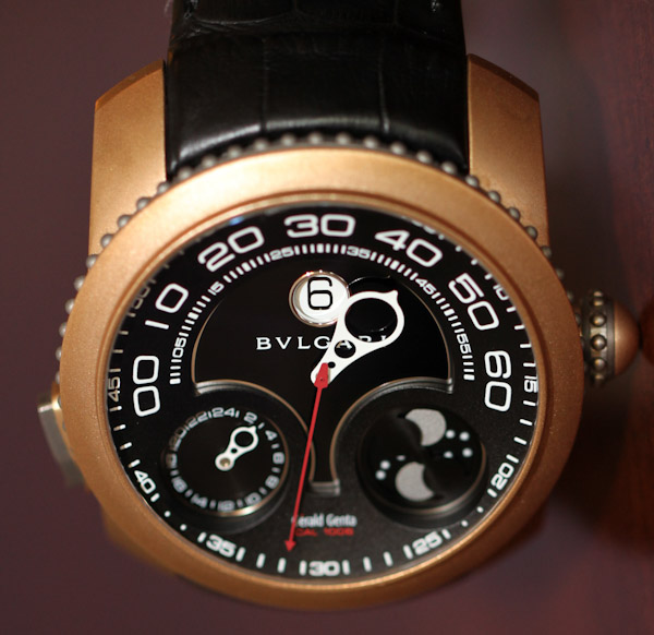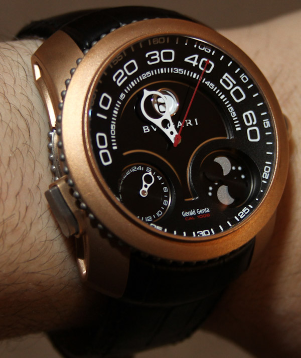 在表盤上,您共享了 Bulgari 和 Gerald Genta 品牌。根據寶格麗的說法,這樣的手表屬于“Gerald Genta 美學系列”。我懷疑幾年后,Gefica 和其他型號的 Gerald Genta 品牌將被淘汰。并不是說我不希望寶格麗尊重這些手表的起源,但對于新消費者來說,多重品牌無疑充其量只會讓人感到困惑。例如,Bulgari的名字刻在鈦金屬表扣上,但“Gerald Genta”字樣仍淡淡地刻在機芯的自動陀上。目前,您仍然可以享受兩個世界的品牌元素。