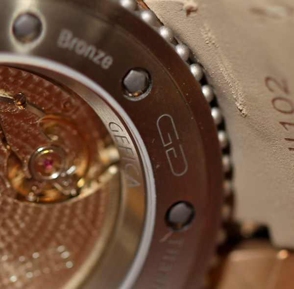 Gefica 案例的設計非常驚人。就像我說的,不是每個人都會喜歡它,但有很多值得欣賞的地方。首先,為什么是青銅?對于大多數手表來說,青銅實際上是一種非常糟糕的表殼材料。這是因為青銅會很快老化并氧化。這意味著從極度變色到表殼表面綠色碎片的生長。您會注意到,手表的底蓋是鈦金屬的。這是因為青銅不應長時間與您的皮膚接觸。然而,對于這種部落古色古香的外觀,青銅是有意義的。Genta 希望箱子隨著時間的推移而老化。他的想法是,佩戴者實際上會使用一個特殊的工具來“清潔”老化的手表。結果看起來像是舊的但被照顧的東西。