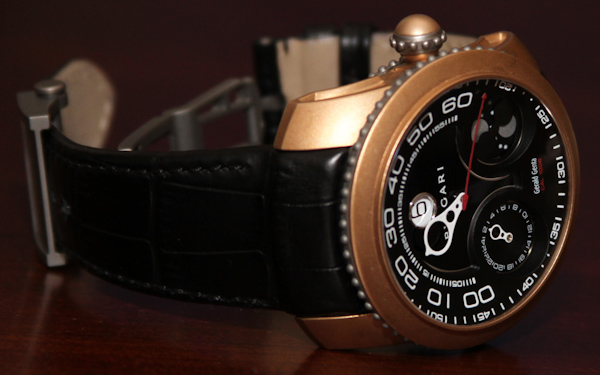 您會情不自禁地愛上巧妙的逆跳分針。頂部越來越寬,它是開放的,以免過多地阻擋小時窗口。大小也使它清晰可辨。以這種方式閱讀時間實際上是令人愉快的。該機制是敏感的,需要適當的照顧。根據寶格麗的說法,你不能調整得太快,我認為他們建議只朝一個方向調整。為了使手表的設置更容易和更安全(并在系統卡住時幫助重置系統),還有一個額外的嵌入式按鈕來調整小時盤。表殼上方是高度圓頂的藍寶石水晶。它確實有很多 AR 涂層,但考慮到曲線,它仍然反射光線。盡管如此,彎曲的水晶還是很漂亮,而且由于其清晰度,為表盤提供了很多易讀性。