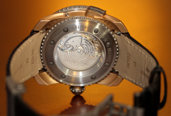 手表背面是深鑲藍寶石底蓋窗口。機芯整理不同于我以前見過的任何其他東西。杰拉德·尊達 (Gerald Genta) 稱其為“陶工”式的精加工。我稱之為“微細紋”,它覆蓋了機芯和自動擺陀的整個表面。大多數機芯都有不同的表面處理,以突出機制的不同部分。在這里,可視區域幾乎都覆蓋在相同的拋光劑中。它具有獨特的外觀,并提供完全不同的東西。