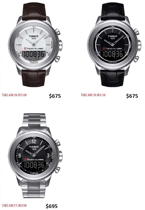 T-Touch 手表都有模擬表盤和 LCD 屏幕。在許多情況下,表盤上的指針會自行重新調(diào)整以協(xié)助執(zhí)行功能。例如,當(dāng)手表處于羅盤模式時,指針會變成一根針。T-Touch Classic 內(nèi)部搭載瑞士 ETA E49.301 石英多功能機(jī)芯。它提供時間、完整日歷、指南針、潮汐圖、帶分段時間和航海日志的計時碼表、兩個倒數(shù)計時器、兩個鬧鐘、第二時區(qū),并且有背光。根據(jù)表盤的不同,LCD 屏幕可以是標(biāo)準(zhǔn)的也可以是負(fù)片的(對于黑色背景上較淺的文字)。表盤看起來沒有夜光,但可以激活屏幕背光以在黑暗中查看表盤。