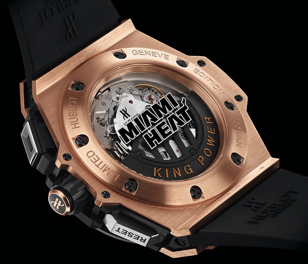 手表內部是瑞士自動 Hublot 機芯。鏤空表盤展示了運轉中的機芯元素,并且這款腕表配備了 King Power 腕表的獨特擺陀。每只限量 200 只,這款手表將裝在一個外觀相當整潔的籃球風格盒子中,每只手表都將隨附由 Udonis Haslem 簽名的邁阿密熱火隊球衣。