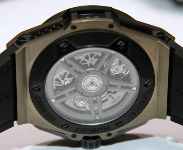 Big Bang Ferrari 內部裝有自制的 Hublot Unico 1241 自動計時碼表機芯。這是首批配備較新自制機芯的手表之一。Unico 是 Biver 的另一項引以為豪的成就——開發和生產適合其低容量超高端手表的自制機芯。1241 型機芯在表盤上完全鏤空,提供時間(無秒)、日期和 60 分鐘計時碼表。機芯的轉子設計得像法拉利汽車的車輪。表盤和表背的鏤空工藝極具技術感和吸引力。Hublot 甚至為更新后的 Big Bang 手表設計了新的指針和時標。另一個巧妙的功能是表冠,無需擰入,而是擰入并牢固鎖定。