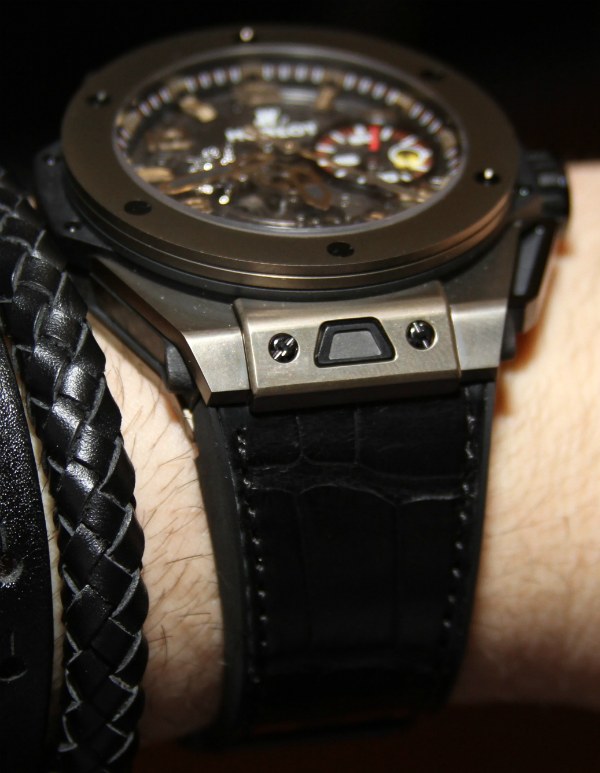 表帶更換系統非常好用。凸耳上有一個推桿,您可以按下它來松開表帶。它點擊退出,然后再次點擊返回。該系統允許佩戴者更換 Hublot 表帶,這對 Hublot 來說可能是一項新的有利可圖的業務——因為它的手表所有者可以根據自己的喜好親自更換表帶。