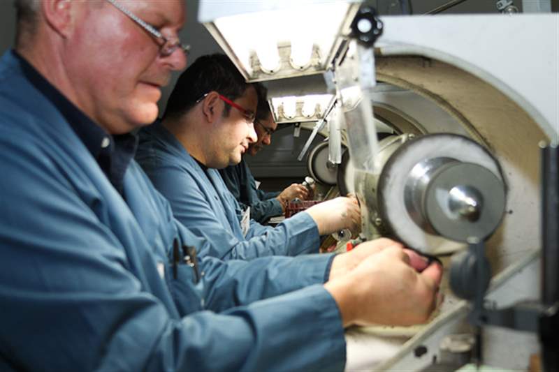 大樓的拐角處是一個大型停車場,可停放所有員工的汽車。有很多人在制造廠工作。雖然他們中的一些人從事辦公室工作,但這些人中的大多數是鐘表制造商、零件制造商和機器操作員。從各個方面來說,它都是一家工廠。他們擁有從嘈雜和油膩的機房到經過消毒的房間,鐘表制造商坐在頂層享受最好的自然光線。