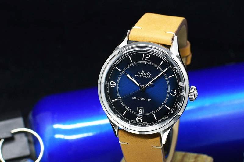 美度手表有一個(gè)世紀(jì)的歷史。該款表揭開了 Multifort 的面紗,采用全新復(fù)古設(shè)計(jì)。不銹鋼表殼寬 40 毫米,厚度 11.95 毫米,經(jīng)過全面拋光處理。表殼具有獨(dú)特的形狀,短表耳向內(nèi)“扭曲”,營造出復(fù)古魅力,而不是那些千篇一律的圓形優(yōu)雅表殼。這里的表圈很薄,使其成為全表盤類型,即使采用盒形藍(lán)寶石水晶,手表看起來也很苗條,在大多數(shù)手腕尺寸佩戴都顯優(yōu)雅。帶有凸起字母“Mido”的滾花推拉表冠,經(jīng)雙面防反射處理的藍(lán)寶石水晶鏡面下方是“煙熏”深藍(lán)色表盤,帶來雙邊的美感。