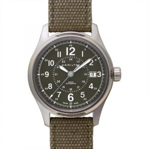 備有綠色表面,不銹鋼表殼和卡其色帆布表帶,H70595963型號看上去沉穩不做作。錄色表面中的立體數字時標和正中24小時的小時圈配起來令時間更加一目了然。日期窗口則在手3點鐘位置。?