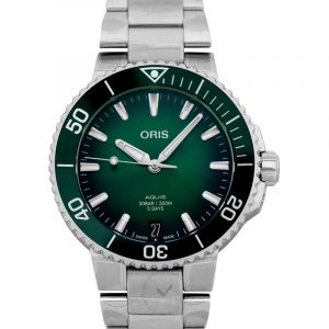 圓形不銹鋼表殼承載綠色表盤,日期顯示在6 點鐘位置,搭配粗大的指標時標和立體銀色時標,01 400 7769 4157-07 8 22 09PEB型號可謂是動態玩家的時尚配件。另外,這款Oris手表配備300米防水功能絕對是深潛愛好者或是專業潛水員都必須入手的功能性潛水表。