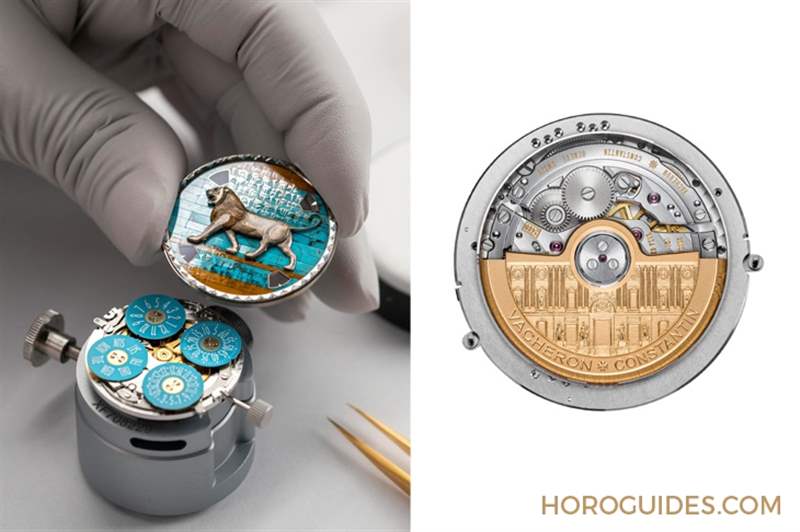 表盤40mm的狹小范圍內(nèi),采用多種工藝再現(xiàn)各個(gè)時(shí)代的裝飾藝術(shù)與文字元素。整個(gè)面盤上布局著極為精細(xì)的相關(guān)背景圖紋,最外緣再裝飾一圈浮雕飾帶,將每個(gè)時(shí)期的藝術(shù)精髓濃縮其中。江詩(shī)丹頓運(yùn)用了內(nèi)填琺瑯和灰階琺瑯、寶石細(xì)鑲、石質(zhì)微砌馬賽克、以及經(jīng)由手工雕刻的金質(zhì)鑲貼工藝,完成表盤上色澤、質(zhì)感變化細(xì)膩豐富的畫面。