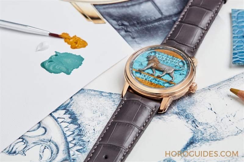表盤中央采用藍(lán)綠色琺瑯裝飾,邊緣飾有石質(zhì)微砌馬賽克,這項(xiàng)繽紛又精細(xì)的裝飾元素,靈感得自四世紀(jì)在以色列洛德市發(fā)現(xiàn)的著名馬賽克裝飾。這幅微砌馬賽克的最終成品使用了逾七種石料,共計(jì)660塊,包括石英石、美蛋白石、藍(lán)線石、血斑石、紅碧玉、石榴石和紅砂金石。