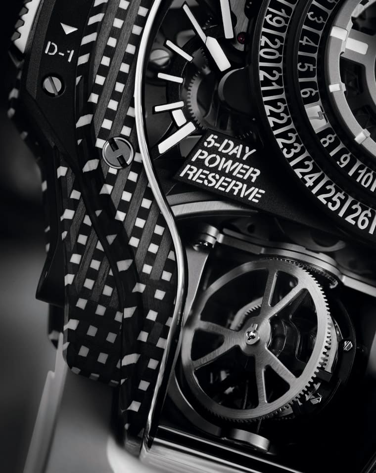 光能做出白色3D碳纖維還不夠,因為MP-09雙軸陀飛輪擁有立體前衛的造型,所以宇舶厲害的地方還包括可以用這種科技材質達到折曲、轉角、傾斜式平面等目的,用以呈現手表的霸氣外觀,甚至品牌也會確保這種新材質應用到未來主義的手表時,它的防水性與耐用性也能跟傳統材質如金屬、陶瓷等一樣可靠。