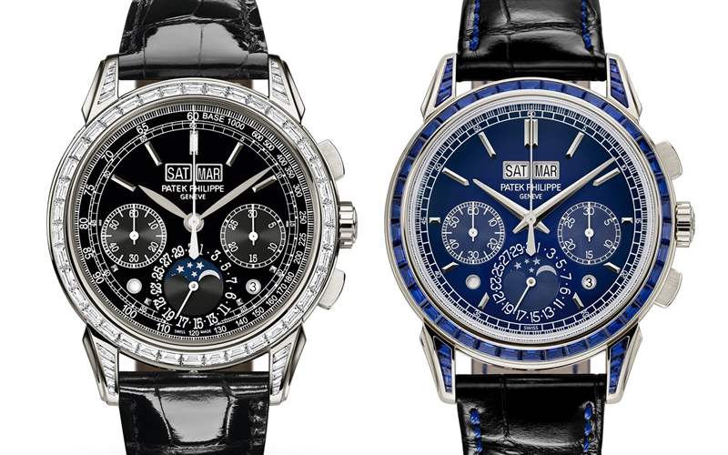Patek Philippe 剛剛推出2枚讓人印象深刻的寶石鑲嵌版 Ref. 5271 萬年歷計時碼表——一枚鑲嵌紅寶石搭配紅色漸變表盤,另一枚鑲嵌藍寶石搭配藍色漸變表盤,表圈和表耳的寶石均采用定制切割,毫無疑問是 Ref. 5270 家族迄今最華麗的成員。