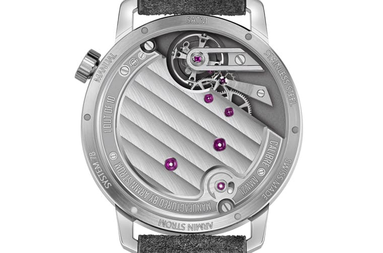 表背可見透明底蓋下方的機芯樣貌,ARMIN STROM以3/4夾板設(shè)計延續(xù)手表的簡約風(fēng)格,3/4夾板表面以大片的日內(nèi)瓦波紋修飾,至于剩下的1/4空間則可見到同樣具備鏤空指型橋板固定的擒縱系統(tǒng),其震頻為25,200vph,介于現(xiàn)代與傳統(tǒng)規(guī)格之間,力求達到穩(wěn)健的走勢效果。 品牌運用不同裝飾工藝,點綴基本功能機芯,真正做到簡約但不簡單的境界,內(nèi)外講究的設(shè)計徹底顛覆大眾對三針手表的傳統(tǒng)觀點。