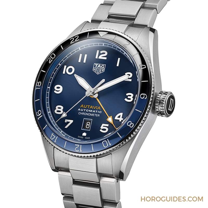 Autavia 60周年的第三款時計為此系列的首款三針GMT雙時區腕表,搭載經瑞士官方天文臺(COSC)認證的Calibre 7機芯。表面以藍色放射太陽紋裝飾,表圈更是巧妙地運用藍色及黑色漸變陶瓷表圈設計,搭配拋光精鋼表殼和涂有Super-LumiNova夜光涂層的時標指針,且配備快拆表帶功能,配戴者可以切換精鋼表鏈或者黑色鱷魚皮表帶。