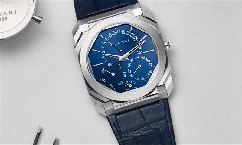這款集超薄與萬年歷兩大復雜功能于一體的腕表,表盤配置別具特色,最特別的是還同時具備兩種逆跳功能顯示-包含位在12點鐘的逆跳日期顯示與6點鐘位置的逆跳閏年顯示。此表款所搭載的BVLGARI自制BVL305自動上鏈機械機芯,厚度僅2.75mm,整個機芯由408枚零件組成,搭載微型自動盤。在不縮小零件尺寸的前提下,為了創造出薄還要再更薄的最大可能性,必須打破制表既有思維,采用全新方式將所有零件與零件之間的空間盡可能縮減,濃縮再濃縮,整合再整合,好比藍寶石表背被整合到表殼中,在依序將機芯由正面放入表殼、放置上表盤、指針、藍寶石表鏡后,再用表圈封蓋整個表殼。包含連表盤上的時標指示都是為了縮減厚度而經過悉心琢磨的細節,纖薄的時標猶如貼花般地分布在厚度僅0.3mm的表盤上。