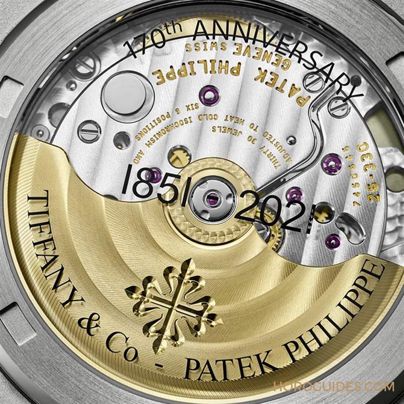 底蓋的2021字樣還藏有彩蛋。表款搭載26-330 SC自動上鏈機芯,底蓋除了印上170th ANNIVERSARY、1851-2021、TIFFANY & Co. – PATEK PHILIPPE等字樣,在2021的數字「1」還印了LVMH,做為祝賀TIFFANY & Co. 加入LVMH Group的隱藏彩蛋。而根據報導中Thierry Stern所說,“I’m very curious to see how long it’s going to take people to discover that there is a secret on every piece,”所謂5711/1A-018的隱藏巧思應該就是指此處,又或者還有其他我們不知道的細節(但可能也只有表主才會知道了)。