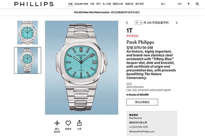 5711/1A-018將在12月11~12日的Phillips紐約拍賣,拍賣編號很給面子的標示為「1T」,目前沒有底價。這款將會是第一只售出的5711/1A-018,收益將百分之百捐給美國的The Nature Conservancy環境保護協會。