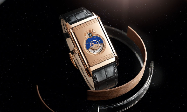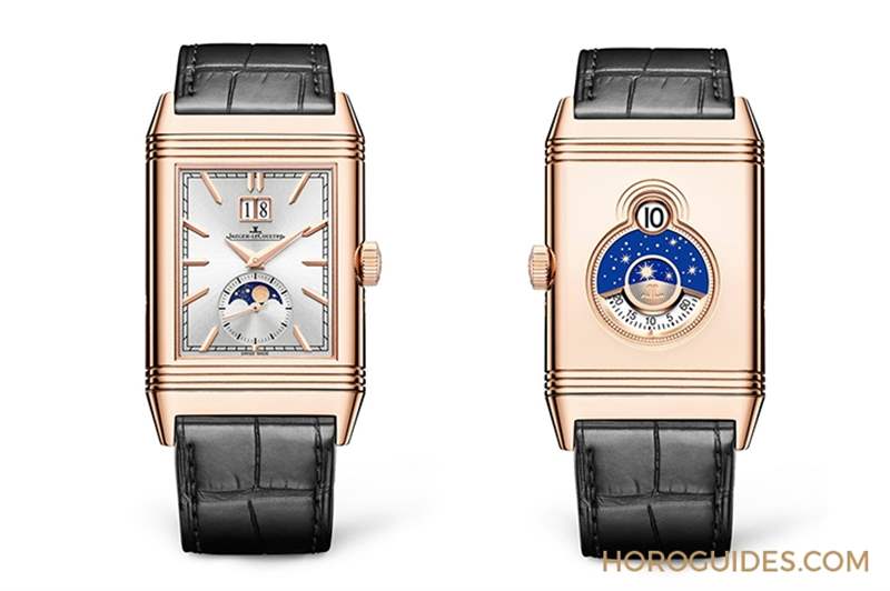 正面表盤展現經典優雅的美學特色,而背面表盤則展現驚奇。翻轉表殼,可見品牌以全新設計呈現常見的制表復雜功能。設計大膽迷人,與之前的Reverso翻轉系列腕表大相徑庭。玫瑰金表背設有兩個大小不同的視窗,其排列外觀呈「8」字形,并以刻紋裝飾圍繞,呼應表殼上、下的直線刻紋裝飾。上方的小視窗為數字式半跳時小時顯示,此復雜功能首次于Reverso翻轉系列腕表出現,令人聯想起1930年代大工坊為腕表設計的數字式顯示。