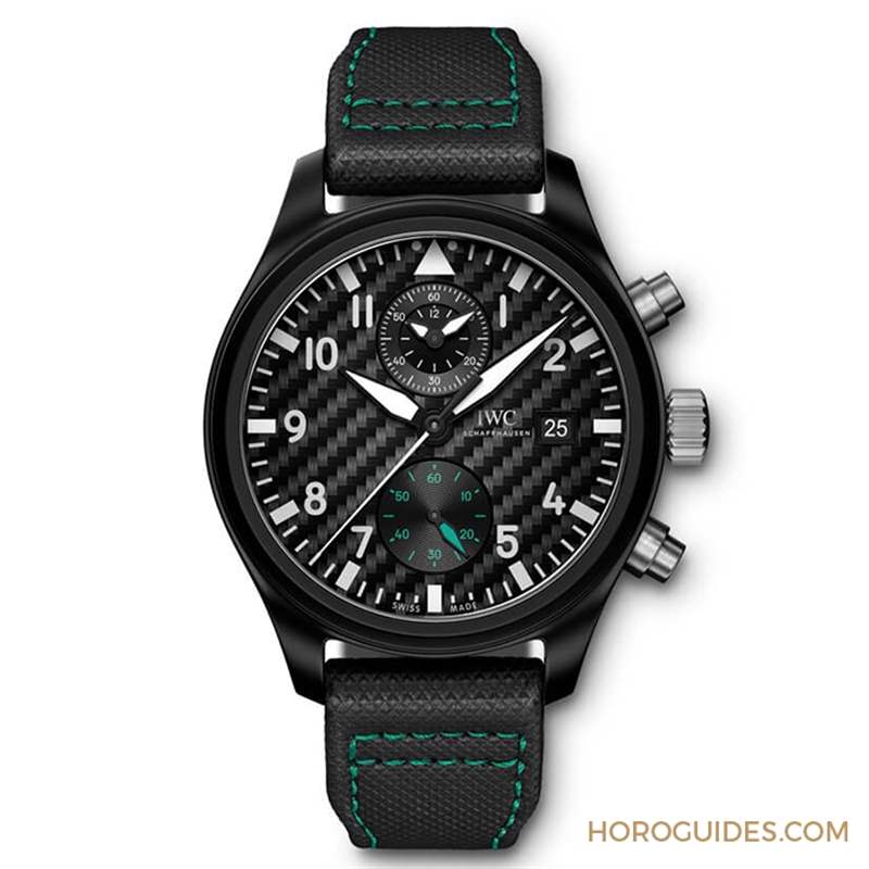 以汽車工程物料打造的飛行員計時腕表「AMG」特別版腕表,也是第一枚搭載69385型自制機芯的43mm飛行員計時腕表。表殼首度使用5級鈦金屬,表面處理帶有啞光灰外觀效果,靈感源自AMG最具代表性的Selenite Grey Magno啞灰車色,材質具有超輕、抗刮特性。表盤以精細的編織碳纖維打造,物料直接取自AMG包圍零件。這些零件的生產過程相當復雜,包括加熱和壓縮,以其出色的質輕、堅硬聞名。原始物料為連續碳纖維,經過紡織機加工為織物結構,使成品具有獨特的編織「碳纖外觀」。