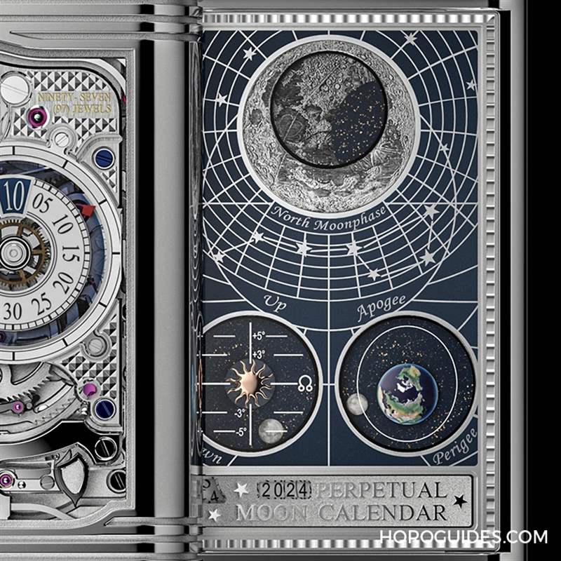 第三面為翻轉(zhuǎn)表殼后的底座,六點(diǎn)鐘位置有年份顯示,上半部有巨大的北半球月相顯示。鍍金裝飾藍(lán)色漆面圓盤根據(jù)會(huì)合周期,慢慢遮擋或顯示下方用雷射雕刻出的月亮。
