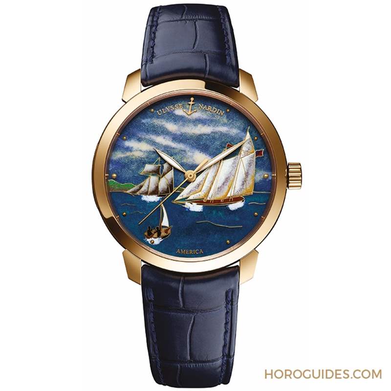 為了紀念1851年由紐約游艇俱樂部(New York Yacht Club,NYYC)的縱帆船《美洲號》(America)與皇家快艇艦隊在英國比賽贏得勝利,成為「美洲杯帆船賽」的起源,雅典表作為Artemis帆船賽隊的合作伙伴,特別推出這款《美洲號》鎏金琺瑯腕表,為這個歷史最悠久的國際體育賽事志慶。以18K白金和紅金材質打造各30只的腕表,40 mm的面盤采用掐絲琺瑯工藝,由Donzé Cadrans琺瑯表盤廠手工制作,描繪美洲號拽起滿帆,在懷特島Isle of Wight的險峻地形中奮進,最終取得勝利的情境。